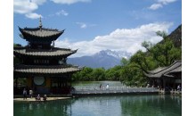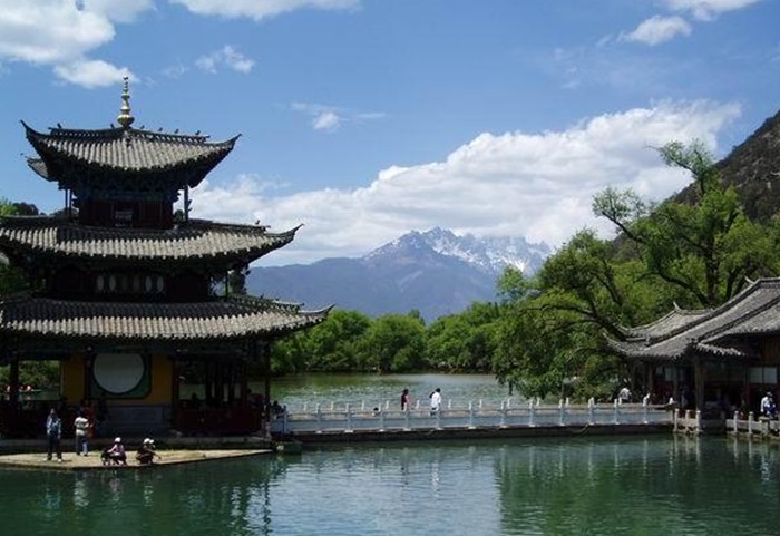麗江黑龍?zhí)豆珗@俗稱龍王廟,位于麗江古城北端象山之麓。黑龍?zhí)秲?nèi)隨勢(shì)錯(cuò)落的古建筑有龍神祠、得月樓、鎖翠橋、玉皇閣和后來(lái)遷建于此的原明代芝山福國(guó)寺解脫林門樓、五鳳樓,原知府衙署的明代光碧樓及清代聽(tīng)鸝榭、一文亭、文明坊等建筑。