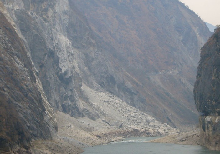 3.如去中虎跳,路上可讓司機(jī)在上虎跳找個(gè)相對(duì)安全的地方停車(chē)看一下。路況很差,山上都是風(fēng)化石,一陣風(fēng)刮過(guò)就撲撲的往下掉,很多路段都路基下沉。