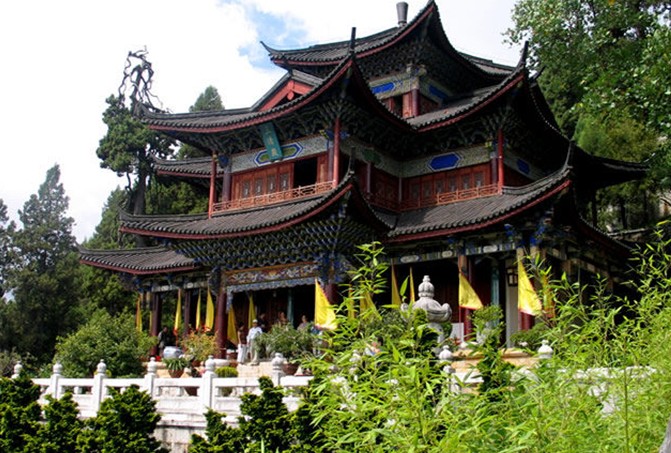 五鳳樓(原名法云間),位于黑龍?zhí)豆珗@北端,始建于明萬(wàn)歷二十九年(公元1601年),1983年被公布為云南省重點(diǎn)文物保護(hù)單位。樓高20米,為層甍三重?fù)?dān)結(jié)構(gòu),基呈亞字形,樓臺(tái)三疊,屋擔(dān)八角,三層共24個(gè)飛檐,就象五只彩鳳展翅來(lái)儀,故名五鳳樓。全樓共有32棵柱子落地,其中四棵中柱各高12米,柱上部分用斗架手法建成,樓尖貼金實(shí)頂。天花板上繪有太極圖、飛天神王、龍鳳呈祥等圖案,線條流暢,色彩絢麗,具有漢、藏、納西等民族的建筑藝術(shù)風(fēng)格,是中國(guó)古代建筑中稀世珍寶和典型范例。