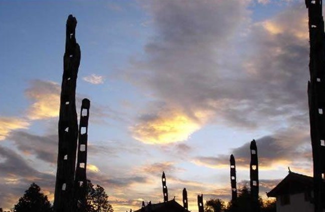 出大研城北走,眼前是一片綿延遼闊的原野,一叢叢樹前,掩映著一個古老的村舍,納西族先民跨過金沙江,從大雪山南下進入麗江壩子,就是在曠野上創(chuàng)建了他們早期的文明。