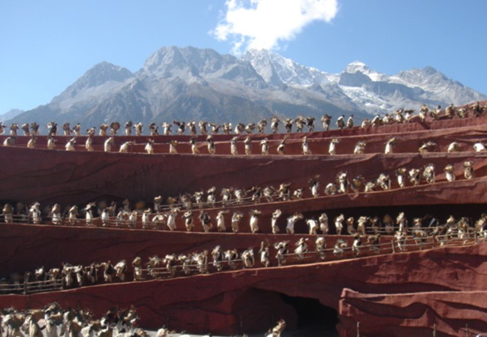 《印象•麗江》是繼《印象•劉三姐》之后推出了又一部大型實(shí)景演出,總投資達(dá)2.5億元,上篇為“雪山印象”,下篇為“古城印象”,主創(chuàng)人員由《印象•劉三姐》的原班人馬組成。《印象•麗江》以玉龍雪山為背景,汲天地之靈氣,取自然之大成,以民俗文化為載體,用大手筆的寫意,在海拔3100米的世界上最高的演出場(chǎng)地,讓生命的真實(shí)與震撼,如此貼近每一個(gè)人。