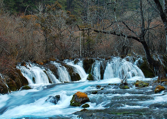 縱攬我國瀑布,或從斷崖驀然跌下,勢若大海倒瀉,銀河決口,聲勢恢宏;或從峭壁凌空飛落,狀如白綾脫軸、裊裊娜娜,姿態(tài)千般;或從洞上翻崖直下,形若水晶珠簾,垂掛洞前,妙趣橫生。而九寨溝瀑布群,則從長滿樹木的懸崖或灘上悄悄流出,瀑布往往被分成無數(shù)股細小的水流,或輕盈緩慢,或急流直瀉,千姿百態(tài),妙不可言,加上四周群山疊翠,滿目青蔥,至金秋時節(jié),層林盡染,瀑布之景就更為神奇秀麗了。