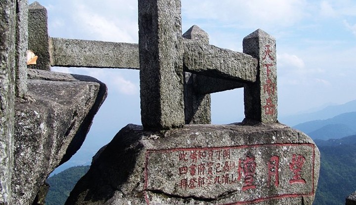 現(xiàn)在山頂?shù)淖H诘钍乔迩∈辏?751年)下詔重建的,石墻鐵瓦。祝融君這位職掌南離的火正宮,經(jīng)過歷代帝王的神化和加官進爵,由隋、唐兩代的“司天王”到宋朝的“司天昭圣帝”,制擬帝王,祀以國典。祝融殿自清朝乾隆重修后,因風霜蝕剝,民國二十一年,時任湖南省主席的何鍵又捐資重修。1982年南岳管理局重新翻修,始成為現(xiàn)在的面貌。祝融殿高踞祝融峰頂,構筑在一個奇石重壘、風急云涌的百多平方米的頂隙里,可以想見當年建筑的艱辛。從祝融峰麓的上封寺到峰頂?shù)淖H诘睿谢◢徥穼訉犹萁拥椒屙數(shù)紫拢穬膳裕沙芍瘢交€漫,頗為潔致。從峰頂?shù)啄_通到祝融殿山門前石砌平臺,有三十多級陡峻的花崗石臺階。山門是座牌坊式建筑,牌坊上有“祝融峰”三字石額,卻未額為“祝融殿”。門兩側有對聯(lián):“寅賓出日,峻極于天。”前者指清晨五到六點時太陽升起,后者說祝融峰頂比天還高峻。這副對聯(lián)的句子集自《詩經(jīng)》,對仗工穩(wěn),渾然天成,又切合祝融峰頂景物,極具匠心。祝融殿右側走廊有另一條小門通向望月臺。望月臺比祝融殿正殿基約高2-3米,是花崗巖風化后裸露而成。整塊巖面不到4.5平方米,靠邊處圍上石欄,既可臨風小坐,也可憑石欄桿眺望。因為它是最高點,所以空景無際,山風襲人,瀟湘帆影,遠近山巒,盡奔眼底。望月臺石上原有不少石刻,因為刻在臺面石上,版權所有山東聊城聊之旅國際旅行社有限公司,轉(zhuǎn)載必究!風雪侵蝕,游人摩挲、踐踏,許多已漸磨滅。現(xiàn)存的有明朝嘉靖丁巳(1577年)九月寶慶知府書刻“望月壇”三個約50厘米見方的字,鐫刻在巖的內(nèi)壁上,楷書橫排。其余在臺石上與臺內(nèi)外峭壁上的石刻還清晰可辨的有“竣極”、“仰止處”、“果是高”、“青云在望”、“青云滿袖”、“山不厭高”、“覺夢處”、“千維綠”、“天外幽賞”、“壽比南山”、“唯我是高,尊峙寰中”等等,大都不知是何年何代刻品。