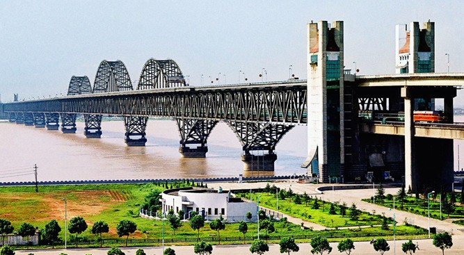 九江長江大橋,始建于1973年12月,由鐵道部大橋工程局勘察設(shè)計(jì),第215橋梁工程處組織施工。是繼武漢長江大橋之后,我國在長江上建造的第八座大橋,也是我國目前最長、工程量最大的鐵路、公路兩用橋。無論是橋的設(shè)計(jì)、施工工藝,還是新型建筑材料的使用等方面,都反映了我國迄今最先進(jìn)的建橋水平。整個(gè)大橋設(shè)計(jì)新穎,造型優(yōu)美,工藝獨(dú)特,雄偉壯觀。大橋鐵路引橋采用的無碴無枕預(yù)應(yīng)力箱形梁,在我國建橋史上還是第一次。主河槽216米寬的大跨度,也居全國橋梁之首。