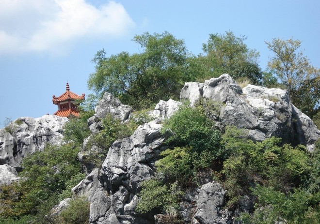 石林位于溶洞山頂,是古生代地殼變動(dòng)而形成,距今有3億多年,面積1000余畝。山上怪石嶙峋,奇花異草點(diǎn)綴其間,相依叢生,風(fēng)光明媚。有桃花谷、松漠亭、達(dá)開峰、藤穿石、象鼻石、強(qiáng)盜床、雙龍戲珠、騎虎難下、八戒戲嫦娥等景觀。景點(diǎn)林濤如潮、林谷如云,讓你猶如步入仙境般的身臨其境。千畝如詩(shī)如畫的石林中古樹名木遍布,珍禽異獸出沒(méi),野花遍地開,小鳥林中鳴,置身其中,如至夢(mèng)幻中,以奇石、奇樹、奇藤、奇峰著稱。奇石:造型奇特、惟妙惟肖,有形狀似白兔、鯨魚、山羊、山猴、野豬、蛇、大象、龍等動(dòng)物,這里石石皆景,景景不同。奇樹:古樹盤踞、丹桂叢聚、翠竹搖拽,與奇石緊緊摟抱。奇藤:千年古藤、環(huán)石纏繞,藤纏樹、樹纏藤。奇峰:青山幽谷,流水叮咚,這里有強(qiáng)盜峰、松漠亭、獨(dú)秀谷、情人谷、幽情谷、南星巖、神寶峰、獅嘯峰、珍珠巖等。攀上光明頂,極目遠(yuǎn)眺,那蒼蒼茫茫的林海,時(shí)隱時(shí)現(xiàn)的群峰,風(fēng)光明媚的田園風(fēng)光盡收眼底。置身于此,如到了世外仙境之中,令您流連忘返。