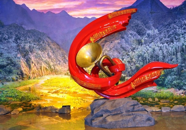 走進(jìn)新館,映入眼簾的是一個(gè)面積600平米,高9米的展覽序廳,最引人注目的是氣勢(shì)如虹的主題背景。據(jù)悉,背景油畫由清華美院師生集體創(chuàng)作,面積為600平方米,為我國(guó)目前最大的油畫。序廳是一個(gè)由巨幅油畫、主題圓雕和實(shí)體山景組合而成的大型多媒體景觀,主題鮮明,氣勢(shì)恢弘。