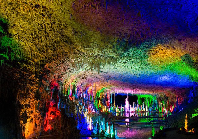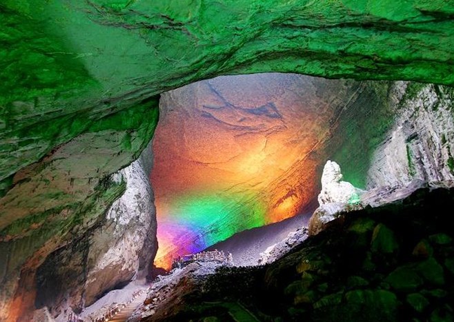 開放游覽主洞第三層、第四層,面積8.l萬平方米,分為穹廬廣廈、長廊石秀、云步通幽等7個大廳。各大廳景觀別具一格,鐘乳、石花、石緯、石柱等組成琳瑯滿目、五光十色的景致。主洞內(nèi)有寬敞的大廳,也有迂回的長廊;有對峙的"高山",也有臥波的"長橋";各種鐘乳石巖溶于奇異狀,瑰麗萬端,宛如一個金碧輝煌的地下宮殿。主洞兩旁又有耳洞、吊洞等10余個大溶洞,上下交錯,版權所有山東聊城聊之旅國際旅行社有限公司,轉載必究!形成洞中有洞、洞下有洞的奇觀,并有陰河穿流其間。陰河河水清澈,魚兒漫游,有發(fā)出微微磷光的亮蝦;有珍稀的玻璃魚,形如蝌蚪,小巧玲瓏,顏色粉紅,全身透明,肝膽可見,聽覺靈敏,難得一見。