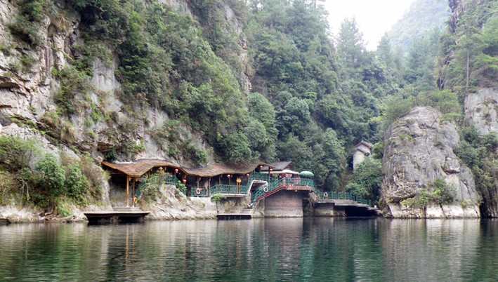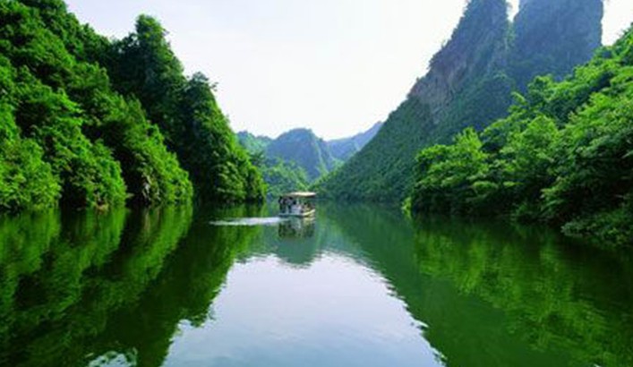 湖中有兩座疊翠小島,近岸奇峰屹立,峰回水轉(zhuǎn)。泛舟漫游,只見(jiàn)一湖綠水半湖倒影,充滿(mǎn)詩(shī)情畫(huà)意。“云梯萬(wàn)丈上天臺(tái),高峽平湖一鑒開(kāi),王母瑤池金扶,浣沙仙女下凡來(lái)”游寶峰湖,你就會(huì)欣賞到這樣的詩(shī)情畫(huà)意。群峰擁抱的寶峰湖,長(zhǎng)約2.,5公里,湖猶如一面寶鏡,四面青山,一泓碧水,蕩槳溫游,格外愜意。坐在船上,環(huán)顧四周,千山聳翠,俯視水中,倒影慢移,碧水照相館得群峰綠,人面桃花水映紅。真是靜極了,美極了!韓劇《九天洞》拍攝的湖水就是寶峰湖。