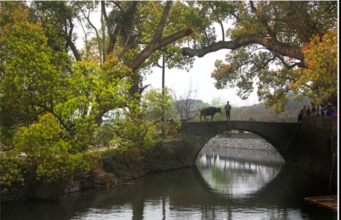 在鴛鴦湖和彩虹橋之間,寬闊的柏油公路蜿蜒伸展,沿途阡陌相聯(lián),綠山相接,村煙裊裊,雞犬相聞。車過甲路鄉(xiāng)政府,轉(zhuǎn)眼就在一棵濃蔭覆蓋的碩大樟樹下,展現(xiàn)出一派綺麗的田園風(fēng)光,這就是嚴(yán)田古樟民俗園。