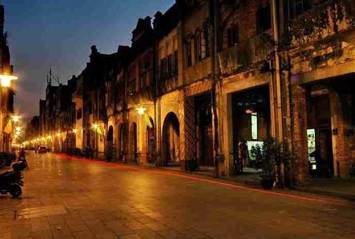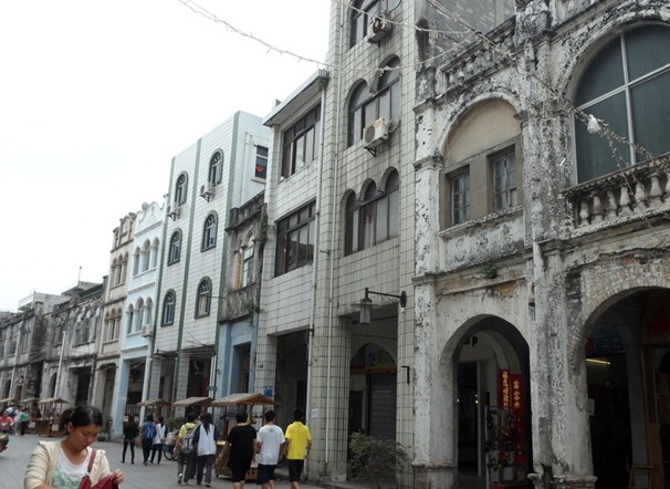 北海老街——珠海路是一條有一百多年歷史的老街,始建于1883年,長1.44公里,寬9米,沿街全是中西合璧騎樓式建筑。這些建筑大多為二至三層,主要受19世紀(jì)末葉英、法、德等國在我市建造的領(lǐng)事館等西方卷柱式建筑的影響,臨街兩邊墻面的窗頂多為卷拱結(jié)構(gòu),卷拱外沿及窗柱頂端都有雕飾線,線條流暢、工藝精美。臨街墻面部不同式樣的裝飾和浮雕形成了南北兩組空中雕塑長廊。這些建筑臨街的騎樓部分,既是道路向兩側(cè)的擴展又是鋪面向外部的延伸,人們行走在騎樓下,既可遮風(fēng)擋雨又可躲避烈日;騎樓的方形柱子粗重厚大,頗有古羅馬建筑的風(fēng)格。