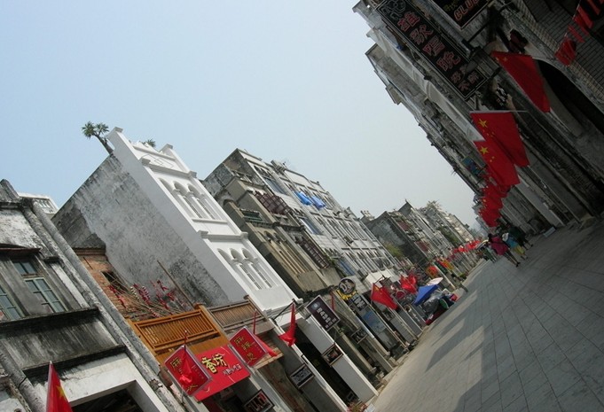 老街的建筑有自己的地域特色,又吸收了嶺南建筑的特點,還吸取了西方建筑的一些藝術(shù)風(fēng)格,前店后居的建筑格局、中頂鋪、拖籠門、西式女兒墻裝飾.