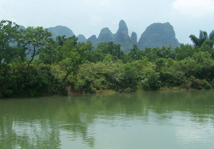 如果說(shuō)桂林的山是“鳥(niǎo)鳴山更幽”,那么,桂林的水則是清澈透明﹑綠得欲滴。俯首看去,江水泛著細(xì)細(xì)的漣漪,玉塔微瀾,水色晶瑩剔透,加之兩岸竹林婀娜多姿,山水相映成趣,怎么看都是一幅長(zhǎng)長(zhǎng)的山水畫(huà),凝重中透露著靈動(dòng)之氣,真是“舟行碧波上,人在畫(huà)中游”。