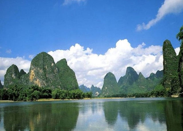 黃布倒影是漓江精華中的精華,位于漓江83公里精華段興坪古鎮(zhèn)境內(nèi),游船經(jīng)過(guò)楊堤,過(guò)了九馬畫山,江面逐漸開闊,水平如鏡,青峰倒影,美不勝收。離畫山之南不遠(yuǎn),便是黃布灘。漓江山色之美,美在倒影中;漓江倒影之美,就數(shù)黃布灘倒影最為醉人。這里江流清澈,碧綠透底,從水面上可以看到江底有塊米黃色的大石板,長(zhǎng)、寬各數(shù)丈,恰似一匹黃布平鋪在河床之上,黃布灘由此得名。
