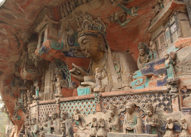 大足石刻[1]位于重慶市,以大足區(qū)[2]、潼南縣、銅梁縣、壁山縣為范圍,在此地可賞到代表中國唐、宋時(shí)期的石刻造像藝術(shù)。 大足石刻是大足區(qū)境內(nèi)主要表現(xiàn)為摩崖造像的石窟藝術(shù)的總稱。 大足石刻群有石刻造像70多處,總計(jì)10萬多軀,其中以寶頂山和北山摩崖石刻最為著名,其以佛教造像為主,儒、道教造像并陳,是中國晚期石窟造像藝術(shù)的典范。規(guī)模之宏大,藝術(shù)之精湛,內(nèi)容之豐富,可與敦煌莫高窟、云岡石窟、龍門石窟齊名。