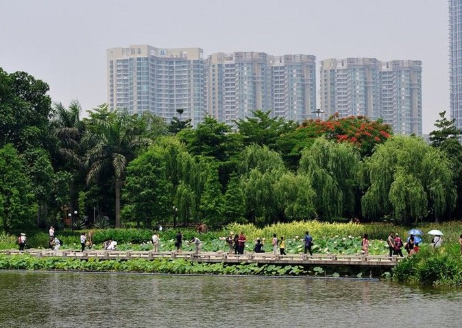 廣州東山湖公園以湖為主,以堤岸組成游覽干線,北堤種植細(xì)葉榕,中堤種植蒲桃、垂柳、紅花紫荊。湖中有4個(gè)半島和2個(gè)小島.分別以九曲橋、落虹橋、拱橋、五孔橋及三曲橋相連,每逢春暖花開(kāi),桃紅柳綠,景色優(yōu)美,湖面碧波蕩漾,花木繁茂。故曾被評(píng)為羊城新八景——東湖春曉。