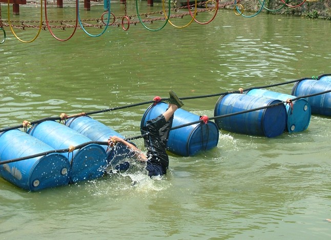 參訓(xùn)隊員必須從岸邊的起點,利用空中的長繩蕩到水面的兩個1平米的平臺上,一個平臺站滿人后再轉(zhuǎn)移到另一平臺上,每個平臺目前最多可站26人。訓(xùn)練各級人員相互理解、互相包容,相互支持與緊密合作,打破隊員之間、男女之間、部門之間的隔閡,勇創(chuàng)佳績的決心和勇氣。
