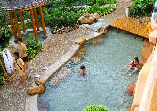依山而建的古兜溫泉,集山、泉、湖、海為一體,風(fēng)景優(yōu)美,有著豐富的溫泉資源,在古兜山下新近落成的溫泉谷,格調(diào)高雅,打造出一個(gè)不同凡響的溫泉王國(guó)。溫泉谷中間有一條約150米長(zhǎng)的人工鵝卵石河道,它不僅為景區(qū)增添了春山幽谷的野趣,更和中央水區(qū)的大舞臺(tái)及各大小泡池相連,將谷內(nèi)建筑群落自然分成了三大區(qū)域:北邊是歐式風(fēng)格的“羅馬殿”,東邊則是日本和式風(fēng)格的“東瀛閣”,南邊是“唐宮”。