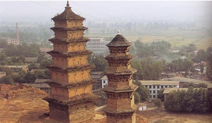 華嚴(yán)寺是中國佛教華嚴(yán)宗的祖庭。華嚴(yán)寺由初建到以后數(shù)百年間,無高大殿堂建筑的記載,而只記有鑿原為窟,以安置佛像及僧眾居住,華嚴(yán)寺可以說是黃土高原上一座典型的窟洞寺院。從塔的記載看,這里曾有華嚴(yán)宗初祖杜順坐定身骨的墓塔、二祖智儼塔、三祖賢首塔、四祖澄觀塔。但在清乾隆年間,發(fā)生了少陵原崩塌事件,僅存磚塔兩座,其余全毀。一九三0年陜西大旱,朱子橋居士來陜西賑災(zāi),與佛教界人士瞻禮華嚴(yán)寺塔時,見到元代重修碑內(nèi)有"修塔即降甘露"的文句,便于塔前發(fā)愿"重修兩塔,祝愿普雨"。不日即天降大雨,朱子橋遂與佛教界人士動工修塔。