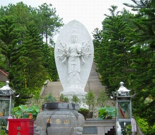 游人踏進朱紅色的公園大門,直抵觀音山麓。跨過草地,拾級而上的便是觀音山幸運臺階,這是游客登高“迎幸運”的最好去處。在大型臺階的平臺上,屹立一尊漢白三千手觀音像,一石成型,身高6.8米,重達8噸 是目前全國罕見的漢白玉觀音塑像,堪稱中華雕刻藝術瑰寶。