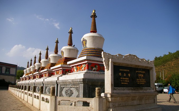 大拉浪由經(jīng)堂、華門、牌坊3座殿堂組成,為漢藏合璧式建筑,是塔爾寺總法臺(tái)的居住處,達(dá)賴、班禪曾駐蹕于此。居巴扎倉(cāng)(密宗學(xué)院)系藏式平頂建筑。曼巴扎倉(cāng)、丁科扎倉(cāng)屬漢藏結(jié)合建筑。寶塔數(shù)十座,其中并列于寺前的8座如意寶塔,方座,瓶形塔身,尖頂,根據(jù)釋迦牟尼一生重要經(jīng)歷和傳說(shuō)建成。 最后終于有了塔爾寺。