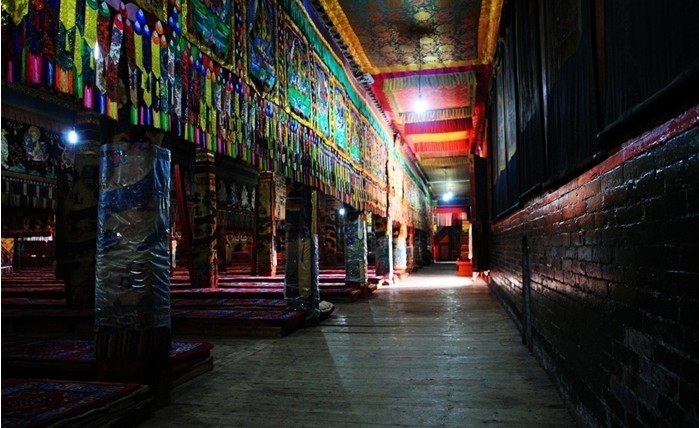 大經(jīng)堂是土木結(jié)構(gòu)的藏式平頂建筑,是塔爾寺建筑中規(guī)模最大的。其建筑面積近2千平方米,是擁有168根大柱的大型經(jīng)堂,初建于明朝萬(wàn)歷三十四年,即公元1606年。它是寺院喇嘛集中誦經(jīng)的地方,堂內(nèi)設(shè)有佛團(tuán)墊,可供千余喇嘛集體打座誦經(jīng)。內(nèi)部陳設(shè)非常考究,飾有黃、紅、綠、藍(lán)、白五色的幡、幃和各式天花藻井,滿堂林立;還有珍貴的大型堆繡掛佛、刺繡佛;梁檐上繪有藏式風(fēng)格的圖案花紋,彩畫細(xì)膩生動(dòng)。版權(quán)所有山東聊城聊之旅國(guó)際旅行社有限公司,轉(zhuǎn)載必究!殿內(nèi)大柱都由龍鳳彩云的藏毯包裹,整個(gè)經(jīng)堂五彩繽紛,富麗堂皇。在1千多平方米的屋面上,按照宗教法制和西藏傳統(tǒng)藝術(shù)、裝有銅制鎦金的金鹿法輪、各式金幢、寶瓶、寶塔、寶傘和倒鐘等,把一個(gè)單調(diào)的草泥平頂打扮得絢麗多彩。遠(yuǎn)眺平頂,金碧輝煌,給人以威嚴(yán)之感。