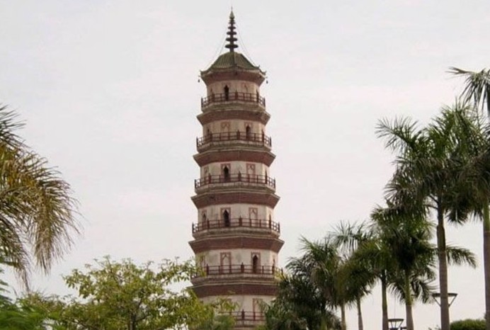 金鰲洲塔位于東莞市莞城西南1公里處,即萬江橋畔。因其座落于萬江金鰲洲,故名。金鰲洲古塔始建于明朝萬歷二十五年(1597年),合尖于天啟四年(1624年),歷時27年。據(jù)悉,建塔之目的為“以培風氣,亦堪興家所宜也”。原為抗御水害的鎮(zhèn)水寶塔,8角10層,蓋頂有塔剎,無塔檐,無欄桿,磚牙疊砌。后于清乾隆二年(1737年)重建,塔基距水邊僅三、五米之遙,此塔處于江心陸洲,三面環(huán)水,經(jīng)二百五十多年,保存完整,基礎穩(wěn)固,巍然聳立于東江之濱。