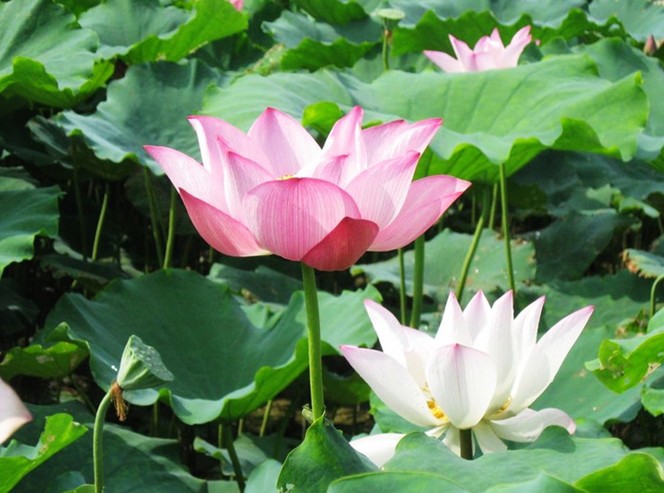站在青石砌成的觀賞臺上,憑欄而觀,仿佛是綠波蕩漾中的一葉小舟,在此起彼伏的一片荷海中,隨波輕漂,粉霞點(diǎn)點(diǎn),宛如天成的錦繡。怒放者有之,含苞者有之,傲然挺立者有之,含羞隱藏者有之,形態(tài)各異,各種風(fēng)姿盡收眼底。
