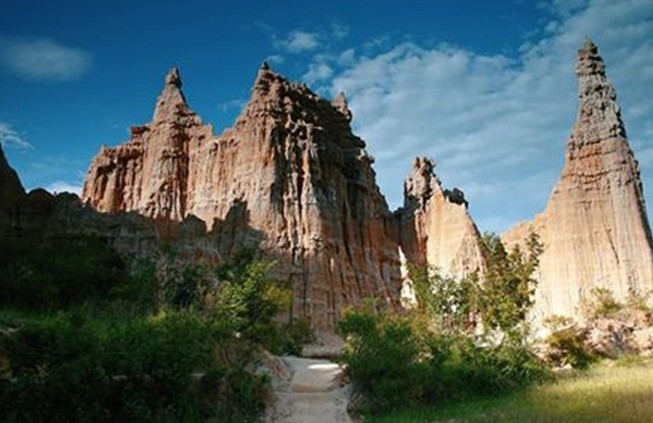 虎跳灘土林的景點(diǎn)分布在主溝和支溝兩側(cè)。主溝為東西向的干涸河床,寬10?40米,總長(zhǎng)1500米,河床表面為黃色細(xì)砂和彩色礫石。支溝分布在主溝南北兩則,寬0.5-8米,總長(zhǎng)4300米。土林佳景大多集中在支溝兩側(cè)。主溝的北側(cè)有元帥府,古堡幽情,駱駝峰3條支溝;南側(cè)有無(wú)名溝,歐亞奇觀2條支溝;另外還有幾條小支溝尚未命名。版權(quán)所有山東聊城聊之旅國(guó)際旅行社有限公司,轉(zhuǎn)載必究!歐亞奇觀是虎跳灘土林最佳景觀,這里土林高大挺拔,造型大都似古代宮廷殿堂,中西合璧,相映生輝。元帥府土林以動(dòng)物造型為特色,如熊貓、獅、虎、鷹、雕等走獸飛禽,惟妙惟肖。古堡幽情以赤、褐、黑三色土帽蓋頂而取勝。