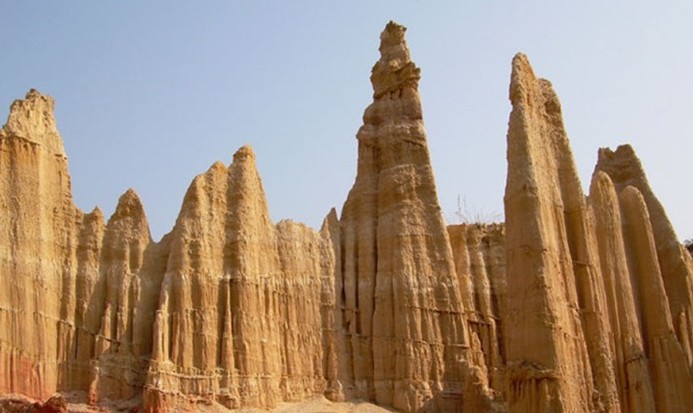 虎跳灘土林位于元謀縣城西北32公里的物茂鄉(xiāng)虎溪行政村,又稱物茂土林,芝麻土林,總面積2.3平方公里。虎跳灘土林形狀以城堡狀、屏風(fēng)狀、簾狀為主,高度一般10?15米,最高27米。
