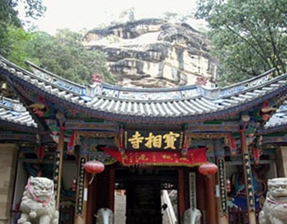 石窟道觀寶相寺,位于佛頂山上,依山建筑在一堵高聳險(xiǎn)峻的大石崖上,下層是大殿,二殿為寺觀,鑿石抬梁,被譽(yù)為“云南的懸空寺”.