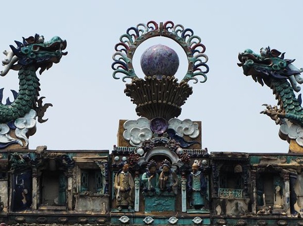 主體建筑東西闊40米,南北深54~60米.是磚木混合結(jié)構(gòu)。屋舉9架梁,房頂是5級疊階梯形的風火山墻,上蓋綠灰筒瓦,采用藍色琉璃瓦剪邊。屋頂正脊和兩側(cè)山墻頂?shù)耐唢椞账苋宋铩⒓癸椡づ_樓閣和舞臺戲曲人物都是清代廣東佛山石灣文如壁店燒制。上有“同治丁卯”(同治六年.即1867年)字樣,隱約可見。屋梁、枋、駝峰、雀替等都做成木雕的工藝構(gòu)件,雕刻成麒麟等吉祥紋飾,遍地金彩。檐板雕刻更是精細,吉祥紋、戲曲人物都雕刻得生動傳神。墀頭上的磚雕花紋也是精雕細刻,獨具匠心。蓮花形的斗拱、支柱梁架的叉手、托架都被雕成倒掛螯魚狀。雀替、駝峰和封檐板等更是通透玲瓏,上漆貼金,是潮州金漆木雕的風格。多層次復(fù)雜的通雕,把浮雕、沉雕和圓雕匯集于同一個畫面上。