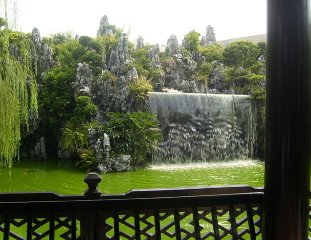 行到回廊深處,便是遠近聞名的“玲瓏水榭”了。它環(huán)水而立,是園內(nèi)第四所建筑俗稱“八角亭”。水榭呈八角形,八面全是窗戶,結(jié)構(gòu)高雅。這樣一來,既能八面通風,又可以八面觀景。對于八角亭的八景,有一首五律詩概括得很好,那詩就是:“丹桂迎旭日,楊柳樓臺青;臘梅花開盛,石林咫尺形;虹橋清輝映,臥瓢聽琴聲;果壇蘭幽徑,孔雀盡開屏。中國園林建筑藝術(shù)風格獨特,強調(diào)詩情畫意。“玲瓏水榭”之所以遠近傳名,就因為它既有詩情,又有畫意。