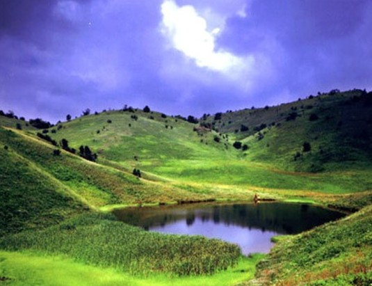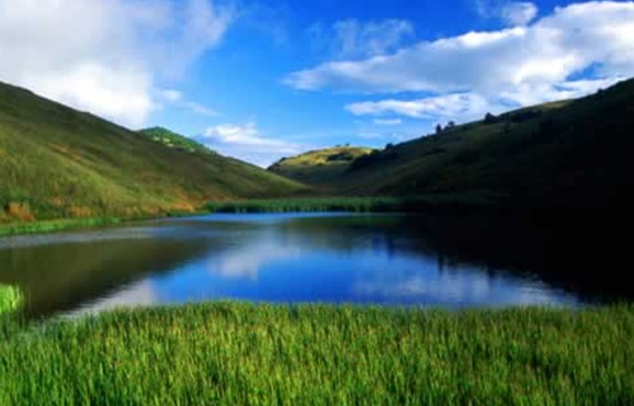 史書載:“水池寬數(shù)畝,且終年渾濁,若投石,頃刻大雨,故名神田”。神河源不足千米,河道峰回路轉,99道灣和神田草原99個山包形成一道絕妙的參照系。土包之間形成了大小不等的32塊草坪,10多個水池,最大的草坪約有1000至2000畝。最大的水池約有3000平方米。奇怪的是這里周圍都是石山,唯獨草原上是深厚的土地,幾乎不見石頭,人走在草地上有如踏在海綿上一樣松軟。