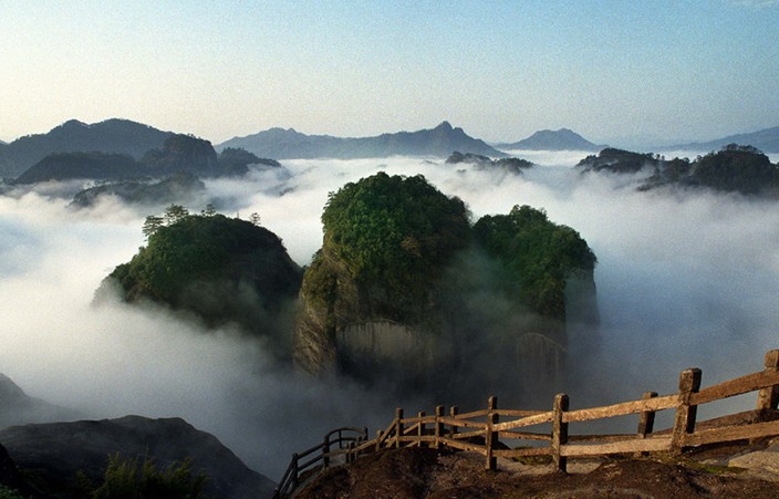 隱屏峰由茶洞從峰南壁攀登即可登臨,因峰巒方正如屏,故名。峰西有一尖銳直上且半腰有橫裂三痕的奇石即為接筍峰。隱屏蹬道極為險(xiǎn)峻,號(hào)為“雞胸”、“龍脊”,原為明代道士汪三寶、劉端陽所開鑿。峰頂有玄元道院、清微道院遺址,還有仙凡界、仙奕亭、南溟靖諸勝,古代號(hào)為“隱屏真境”。峰南的平林渡畔有朱熹構(gòu)筑的“武夷精舍”遺跡。往峰頂向東盤繞,向北可至天游,版權(quán)所有山東聊城聊之旅國(guó)際旅行社有限公司,轉(zhuǎn)載必究!由東南而下則可至仙釣臺(tái)下。