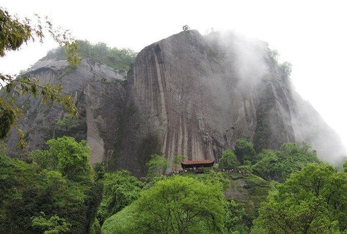 隱屏峰位于武夷山九曲溪中段,隱藏在午林淵深處。云霧迷朦,峭拔千尋,直上直下,方正如屏,故名。坐筏觀山,只能望見它突出林端的半壁,唯有登上溪南的晚對(duì)峰,才能看到它的全貌。