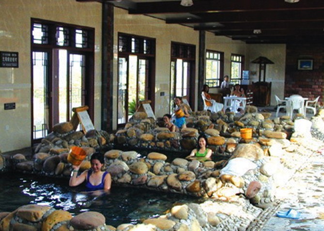 傳說自是不可細考之事,然溫泉水之卻病延年,則已為科學(xué)所證實。蓋以其地?zé)嶂纬桑拷档腿桑欢龋孛嫠序v,則水源巖隙之深,當(dāng)在近千米以下,故其水全無污染,可為飲用之優(yōu)質(zhì)天然礦泉水;經(jīng)化驗,水中含有益人體礦物質(zhì)48種,其中氡與硫化氫之含量,為人體接受之最佳值;每噸溫泉水中,礦物質(zhì)即有35千克之多,故浴于其中,可療膚疾,可擴血管,可舒神經(jīng),可健脾胃。因傳說的關(guān)系,至今每年七月初七,方圓百里村民扶老攜幼,皆來沐浴,只見一片人頭攢、肉體浮沉、蔚為奇觀。