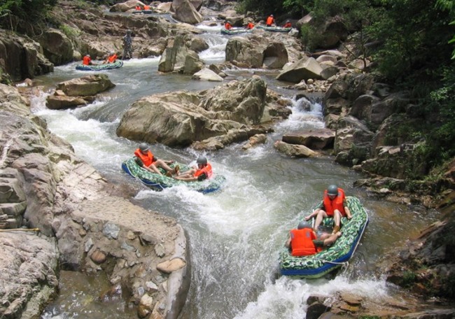 戰(zhàn)船隨著洶涌的河水奔騰而下,峽谷兩側(cè)炮聲隆隆,槍聲不斷,烽煙滾滾,還不時有敵人憑著叢林和怪石作掩護向我小分隊襲擊。當然了,我們勇敢的戰(zhàn)士也毫不猶豫地用手中槍(水槍)予以還擊。在不斷的突破、穿越敵陣的緊張征程中,有著革命樂觀主義精神的戰(zhàn)士們不忘享受穿越激流險灘時的激情澎湃和領略漂浮于平緩流水時兩岸風光盡收眼底的詩情畫意。順流而下,四周山巒起伏,奇峰異石;峽谷峭巖跌宕,鬼斧神工;河道石貌多姿,溪水清澈;兩岸林茂竹翠,花香鳥語;沿途飛瀑奇巖,清溪幽泉,組成一幅美妙的大自然圖畫,恍如置身桃花源中,步入人間仙境。版權(quán)所有山東聊城聊之旅國際旅行社有限公司,轉(zhuǎn)載必究!經(jīng)過一個多小時的戰(zhàn)火征程,3.3公里的航程,戰(zhàn)友們感受了大地的歡歌、生命的激情,終于完成了任務(到了總部終點)。