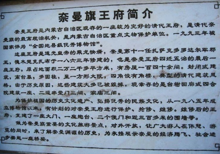 奈曼王府坐落于內(nèi)蒙古自治區(qū)通遼市,始建于清同治二年(公元1863年),為全國(guó)重點(diǎn)文物保護(hù)單位。占地面積9997平方米,有房屋190余間,系臺(tái)榭回廊式四合建筑。原為奈曼部首領(lǐng)札薩克多羅達(dá)爾漢郡王的府邸,現(xiàn)已對(duì)公眾開放.