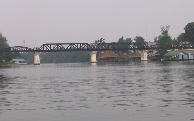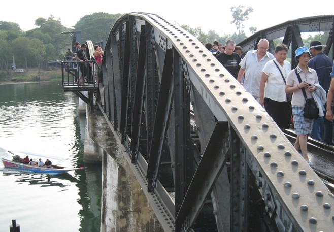 桂河大橋原為木橋,幾經(jīng)飛機(jī)轟炸,早已毀壞,只有在河水很淺時(shí)才能看到殘跡,現(xiàn)在我們看到的是后來修建的鐵橋,它今天還在通車。重建后的桂河大橋,在原來橋的兩側(cè)圓弧鐵架多出了兩段不協(xié)調(diào)的方形鐵架,沒有原先圓弧鐵架的優(yōu)美,很多看過的人覺得不倫不類、不搭調(diào)。桂河大橋大約10分鐘就可以走完,過了橋就是一般的死亡鐵路,一直前行可以通到緬甸。站在桂河大橋的橋頭,看著夕陽下靜靜流淌的美麗桂河,使人難以想象這里發(fā)生過的悲慘故事,只有安放在橋頭的美軍投下未爆炸的炸彈提示著我們當(dāng)年那場(chǎng)慘烈的戰(zhàn)爭(zhēng)。