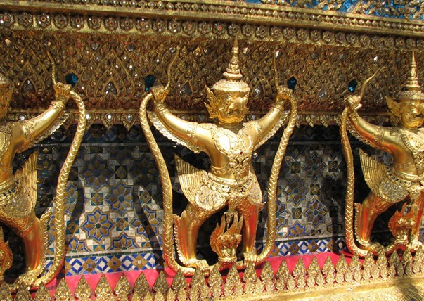 泰國玉佛寺位于曼谷大王宮的東北角,是泰國最著名的佛寺,也是泰國三大國寶之一。建于1784年的玉佛寺是泰國大王宮的一部分,面積約占大王宮的1/4。玉佛寺是泰國王族供奉玉佛像和舉行宗教儀式的場所,因寺內(nèi)供奉著玉佛而得名。寺內(nèi)有玉佛殿、先王殿、佛骨殿、藏經(jīng)閣、鐘樓和金塔。玉佛殿是玉佛寺的主體建筑,大殿正中的神龕里供奉著被泰國視為國寶的玉佛像。玉佛高66厘米,闊48厘米,是由一整塊碧玉雕刻而成。每當(dāng)換季時(shí)節(jié),泰國國王都親自為玉佛更衣,以保國泰民安。每當(dāng)泰國內(nèi)閣更迭之際,新政府的全體閣員都要在玉佛寺向國王宣誓就職。每年5月農(nóng)耕節(jié)時(shí),國王還要在這里舉行宗教儀式,祈禱豐收。寺內(nèi)四周有長約一公里的壁畫長廊,上面繪有178幅以印度古典文學(xué)《羅摩衍那》史詩為題材的精美彩色連環(huán)畫,并附有泰文譯詩。玉佛寺內(nèi)的幾塊大瓷屏風(fēng)上彩繪著中國《三國演義》的故事。