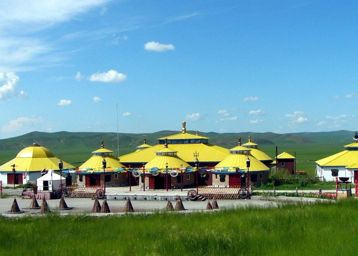 金帳汗旅游部落始建于1994年,是以部落樣式為主體,聚集了以蒙古民族為主的北方少數(shù)民族傳統(tǒng)文化、民俗民風(fēng)、宗教藝術(shù)、餐飲等綜合旅游服務(wù)景區(qū)。現(xiàn)有固定資產(chǎn)200余萬元,占地面積100萬平方米。服務(wù)區(qū)以蒙古民族特色古樸典雅獨(dú)特風(fēng)格的282平方米的磚木結(jié)構(gòu)的蒙古包為主,周圍環(huán)繞坐落成吉思汗金帳、鄂倫春撮羅子、七星帳蒙古包群和達(dá)斡爾山莊,還有400多平方米的民族文化多功能涼廳和600平方米多功能觀賞博克擂臺、民族歌舞篝火晚會場等。可同時接待1000余人就餐,100余人住宿;可舉辦大型民族體育賽會和大、中、小型歌舞表演、篝火狂歡晚會等娛樂活動。設(shè)有馬隊(duì)迎賓、套馬表演、馴馬表演、馬群瞬間攝影、祭敖包、蒙古族博克表演、鄂倫春、鄂溫克、達(dá)斡爾三少民族民情演示、訪牧戶體驗(yàn)生活、騎馬、騎駱駝攝影、騎馬觀光、乘勒勒車、米日桿車觀光、篝火狂歡晚會、民族歌舞表演、射箭、打彈弓、飛鏢等活動項(xiàng)目,已達(dá)到了游、行、住、食、娛、購六大要素為一體的大型民族民情、民族文化的草原景點(diǎn)。