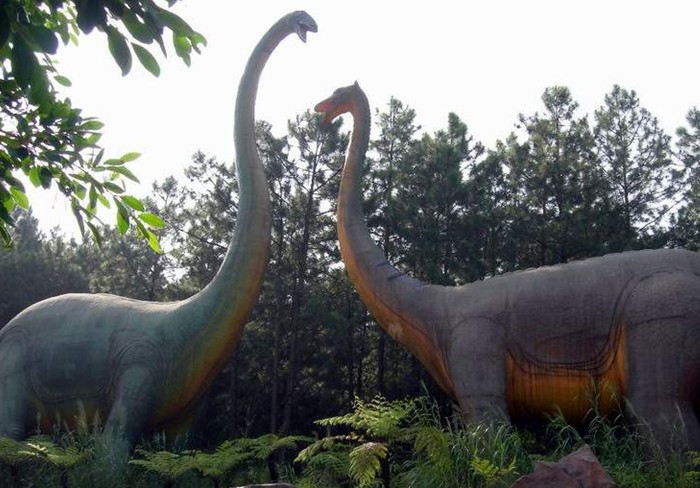 按照1:1的比例設(shè)計(jì)制作的兩條仿真恐龍栩栩如生。較高的是梁龍,身體背部為綠色,尾巴特別長達(dá)16米,脖子也接近13米長,身體總長達(dá)40米,身高達(dá)22米,堪稱目前世界上最高、最大的仿真恐龍!在它旁邊的身高稍矮、體型稍小一點(diǎn)的巨龍也并不能小看,棕黃色的身軀也有18米之高,體長近40米。