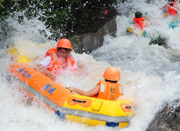 銀盞黃龍峽漂流——清遠(yuǎn)漂流第一站! 銀盞黃龍峽漂流位于廣清高速銀盞收費(fèi)站出口右轉(zhuǎn)8公里處(原國(guó)營(yíng)銀盞林場(chǎng)),具有得天獨(dú)厚的地理環(huán)境和自然風(fēng)光優(yōu)勢(shì),經(jīng)漂流設(shè)計(jì)精英依山取材、精心打造,黃龍峽漂流河道在深山之中蜿蜒約4.3公里,河道首尾落差約108米,最高落差約20米,整條河道有幾十個(gè)跌差之多,一路白練碧潭、奇趣紛呈、驚險(xiǎn)不斷,全國(guó)唯一的雙S回旋彎賽道及多個(gè)精心賽道設(shè)計(jì)讓游人真正體驗(yàn)到挑戰(zhàn)自我的樂趣,而整個(gè)河道經(jīng)年初精心整葺,煥然一新,水質(zhì)大幅提升之余亦做足安全保障。