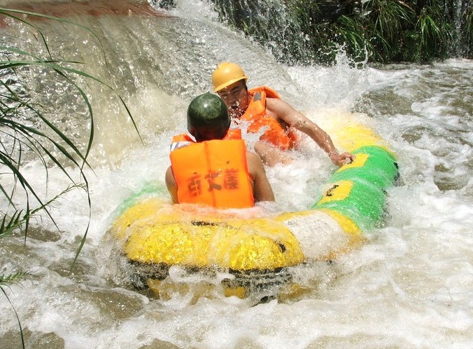 立于灘頭,沿江兩岸有大瑤山隧道、十里畫廊、龜山、蛙石等景點,有十多個回旋處。在漂流過程中,可盡享原始森林峽谷漂流之刺激,更可欣賞融山之雄、水之秀、林之幽、花之美、石之奇、瀑之壯、鳥之鳴、魚之樂于一身的原始森林山谷風(fēng)光。