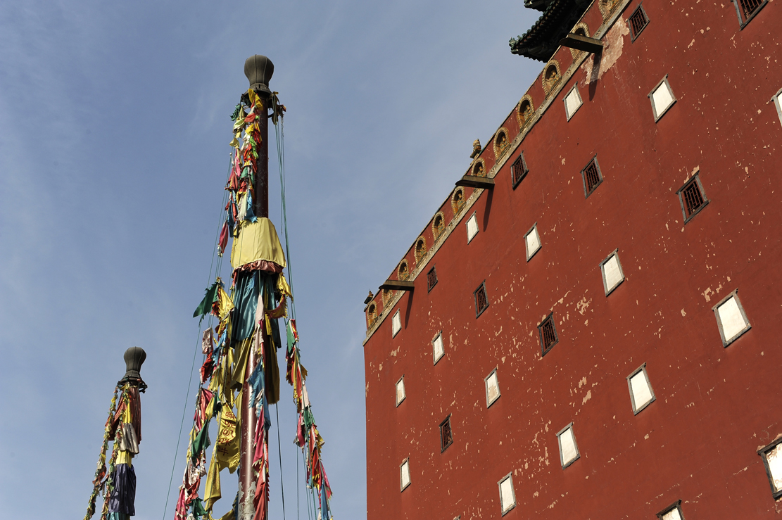 大紅臺南面正中嵌飾垂直琉璃佛龕六個,黃綠相間,版權(quán)所有聊城聊之旅國際旅行社有限公司,轉(zhuǎn)載必究!漢式手法,一是標記軸線,二起裝飾作用。紅臺頂部砌女兒墻,墻下三面 (東、西、南)裝飾黃琉璃佛龕,拔檐石下置排水長槽。紅臺內(nèi)里五至七層為三層閣樓,每層44間,四面合圍,亦稱群樓。
