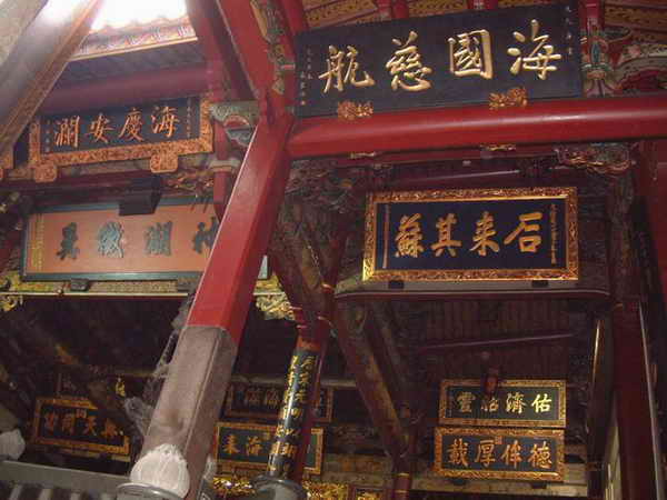 走進臺南大天后宮時,才發(fā)現大天后宮那富麗堂皇,威嚴顯赫的氣派,已極盡了宮殿建筑的豪華壯麗。由大門朝里望,透過三進逐次升高的天井和房舍狹長的空間,可以遙見那香煙繚繞、金黃帷幕下的全身媽祖神像。廟宇堂皇壯觀,信徒眾多,香火鼎盛。由于受到歷代官府的整修和保護,大天后宮內文物保存較多。廟中神像佛像也多為名家雕塑,石雕、木雕的柱、窗、梁都有很高藝術價值。還有許多古碑、古匾、古聯等珍貴的文物,據說單單古匾就有200多塊,平時無法全部掛出來。最寶貴的是雍正皇帝所賜的“神昭海表”、咸豐皇帝的“德侔厚載”、光緒皇帝的“與天同功”等御筆匾。由此可見,大天后宮與普通天后宮、普通廟宇相比,簡直就有一個天上、一個地下的感覺。