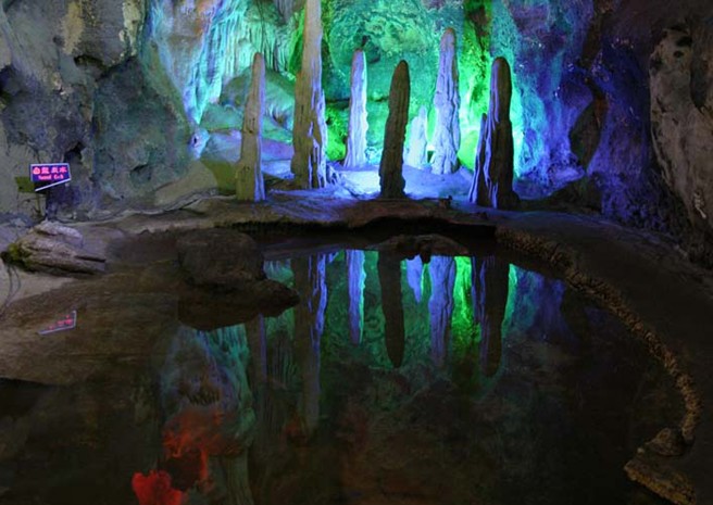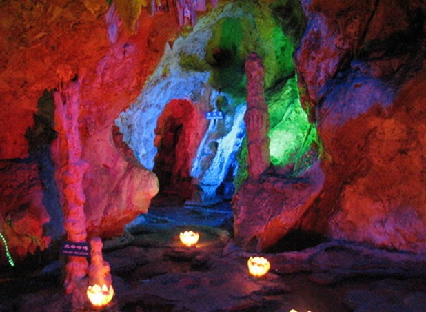 蟠龍洞的特殊景觀有三外:其一是世界三大石花洞之一。洞內(nèi)石花剔透玲瓏,晶瑩如玉,它附著于巖壁之上,不按重力方向生長,版權(quán)所有山東聊城聊之旅國際旅行社有限公司,轉(zhuǎn)載必究!而向四面節(jié)節(jié)開花,見氣成石,繼續(xù)生長,變幻無窮。其二是我國南方典型的大熊貓--劍齒象動(dòng)物群"古動(dòng)物化石區(qū)",最為珍貴的是"智人"古人類化石。其三是蟠龍洞尚未開發(fā)的龍泉地下河,河中有泉眼,每隔十分鐘左右,泉眼波浪翻滾,似海潮洶涌,沖刷河岸,隨后又似退潮,靜靜地回流石洞,經(jīng)專家確認(rèn)為地下間歇泉,是一罕見洞府奇觀。洞長千米,深暗幽邃。里面有高達(dá)30米的螺頂,有深不見底的石罅,寬闊空曠處都能容千人,窄處不能2人并行。在洞內(nèi)跺腳砸壁會(huì)發(fā)出“嗡嗡”回音,給人一種神秘莫測的感覺。洞口朝南,為券拱門,門上坎刻“龍洞熏風(fēng)”四個(gè)篆字,為康熙14年5月立。洞內(nèi)10米處,有一供臺(tái),臺(tái)上神像已廢,只剩臺(tái)下殘存的幾尊羅漢石像身軀。向洞內(nèi)行至30米處,開始向右下方拐彎,回頭外望,只見洞口猶如月牙出山,人稱“回首望月”。繼續(xù)前行,步步廳景。鐘乳石形成的“火燒葡萄架”含珠點(diǎn)翠;石壁上被浸蝕成的“仙人炕”形體逼真;巨石橫貫的“仙人橋”奇特驚險(xiǎn),世間罕見。再向里進(jìn),八戒可見鐘乳石形成的“江豬探海”、“水簾瀑布”、以及多年沖刷而成的“姜池”、“藕池”,池內(nèi)形似鮮姜的鐘乳石如霞似錦。“蓮藕”如雪似玉。“玉龍騰空”尤惹人注目:在高達(dá)20米的洞壁上,有一塊鐘乳石,宛若玉龍,通體覆蓋著銀光閃爍的“龍鱗”,妙不可言;龍頭垂下,嘴里噴球吐玉人,人稱“龍滴水”,滴在下面“蓮花盆”里,四時(shí)不涸。“鷂子翻身”是洞內(nèi)向下延伸的地方,此處游人不能正面行進(jìn),必須翻過身子,雙手攀石倒行;路旁有深不見底的石罅。走過險(xiǎn)境,是一段空闊平坦的地帶,版權(quán)所有山東聊城聊之旅國際旅行社有限公司,轉(zhuǎn)載必究!這兒路面干燥,清風(fēng)習(xí)習(xí)。再向里前進(jìn),便是“倒爬四十步”,雖然路程難走,卻另有一番意境。再向前行200米,有巨石擋堵,不能前往。洞口外200米處為金代佛隱寺遺址,存戲臺(tái)和石碑1通、古柏1株。漫山蒼松翠柏,郁郁蔥蔥;山下溝壑幽深,樹林茂密。
