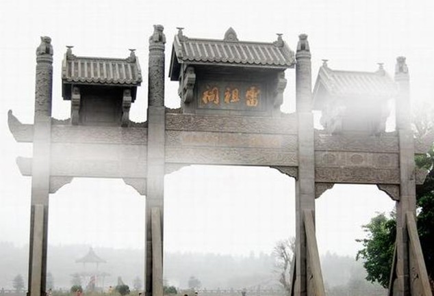 唐貞觀十二年正月十五日,正當城工告竣,文武僚屬歡欣巡城之際,文玉卻生兩翅,白日升天。百官見狀,伏地而拜,文玉終年68歲。為了紀念這一個德政昭彰的地方官,郡民于州城西南五里英鎊山立詞以把,即今之“雷祖調”。調依山而筑,北村南趨,山下是一望無垠的萬頃洋田,其勢極其雄偉壯觀。調分三進,由山門、正殿、側殿、后殿、東西康、鐘鼓樓、碑廊等建筑組成,全部建筑沿中軸線布局。順山門青石板臺階抬級而上可直通后殿,占地面積一萬多平方米,是嶺南地區(qū)最大的洞堂之一。山門依屋字三間面寬洞開而開,為硬山頂,硬山潤模式結構。山門對聯(lián):“霹雪開天南一祖,聲名為海北同尊”,是對雷祖降世的美麗傳說及“受職父母邦,德政彰明”的贊譽。二進為洞的建筑主體,分正殿及東、西側殿。正殿前設有拜事,整個建筑形制呈“凸”字形排列,依次供奉陳文主(中)、李太尉(即漢朝的李廣,居左)及英山石神(右),俗稱“雷桐三殿”。正殿面寬進深各三間,硬山頂,四往格梁式梁架結構,舉梁平緩,前檐顧出檐極寬,建筑風格獨特,富有地方特色。沿著前增顧可從東側殿直通西側殿,殿前屏風精雕細刻,玲挑剔透,巧奪天工。