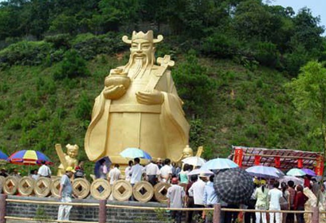 聚寶天地和君子園兩大部分:進入由金磚作墻、兩錠巨大金元寶托起一串金燦燦的古錢幣的景區(qū)大門,便是聚寶天地,走過九宮八卦飛星圖轉(zhuǎn)運壇。隔湖可見一尊全國最大的財神塑像,手捧聚寶盆向人們惠賜財運,轉(zhuǎn)身而望,兩塊寶錠與一座青山組成的天然巨大寶錠遙遙相對應(yīng),何其相似乃爾!環(huán)湖邊是一條由一個個金錢鋪就的丁財路。