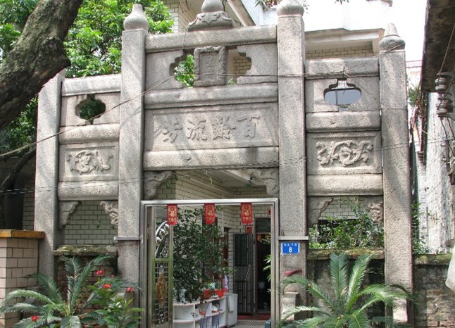 百齡流芳坊位于廣東省中山巿黃圃鎮(zhèn)鎮(zhèn)一村,建于清代道光十八年(1838年)。為四柱三間通天式牌坊,以花崗石雕鑿構(gòu)筑,高5米。正面主間上豎刻“圣旨”(陽刻)二字,下方橫匾陽刻:“百齡流芳”四字,上款陰刻“道光戊戌”,下款陰刻“何高啟立”。背面上豎刻“恩榮”(陽刻)二字,下方橫匾陰刻:“升平人瑞”四字。
